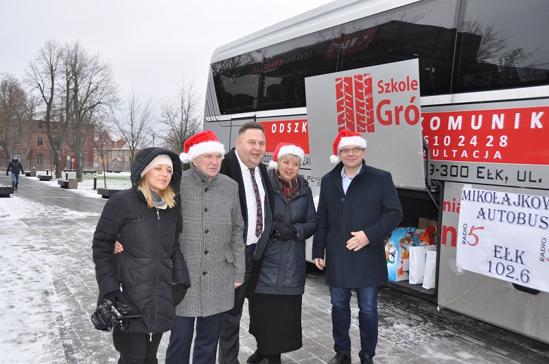 Po raz kolejny władze powiatu ełckiego odwiedziły Mikołajkowy Autobus oraz przekazały paczki do rodzinnych domów dziecka w Ełku i Starych Juchach. Przedświąteczna akcja pomocy dzieciom trwa od 22 lat, a ze względu na pandemię autobus nie jeździ po ulicach miasta, tylko jest zaparkowany przy Placu Miejskim i tam darczyńcy przynoszą prezenty.