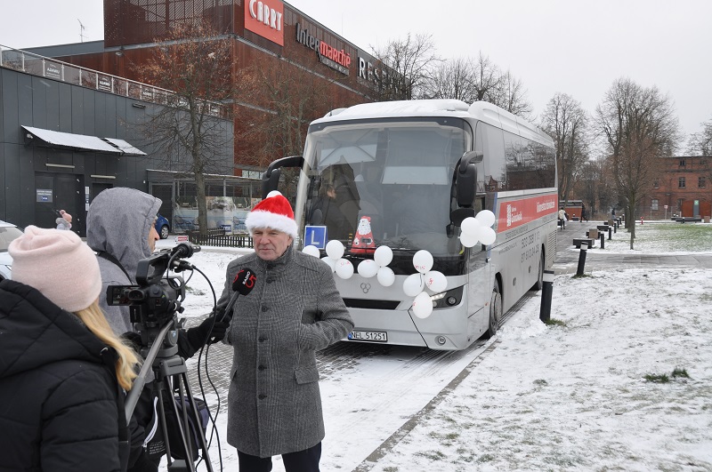 Starosta ełcki Marek Chojnowski w Mikołajkowym Autobusie podkreślił – W tym szczególnym czasie powinniśmy być dla siebie bardziej życzliwi, częściej się uśmiechać i chętniej pomagać innym. Pomaganie jest fajne, a przekazane dobro wraca z podwójną siłą.